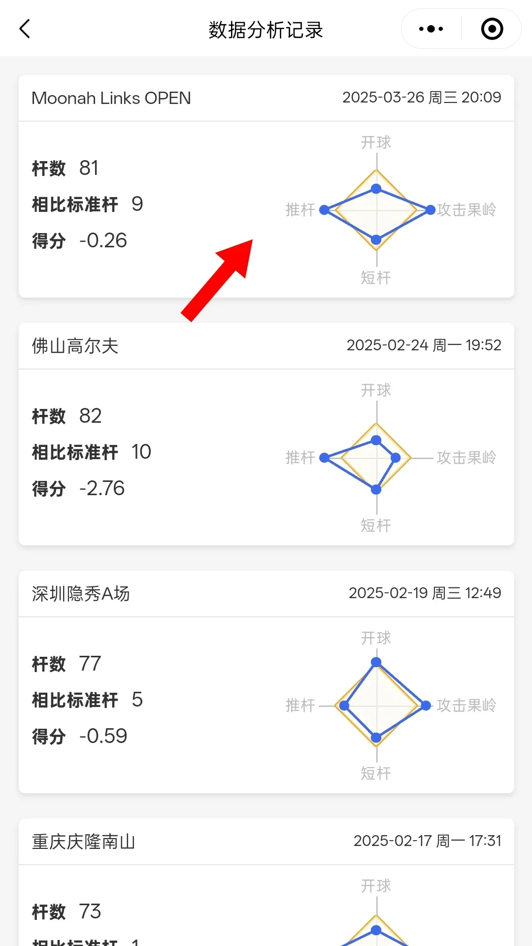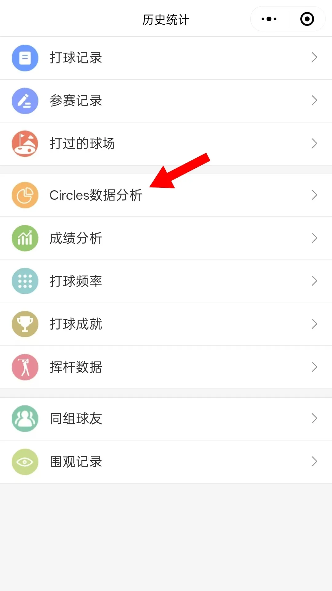 2. 登錄【如歌高爾夫小程序】→【歷史】→【Circles數(shù)據(jù)分析】→ 選擇對(duì)應(yīng)的完賽輪次獲取 。