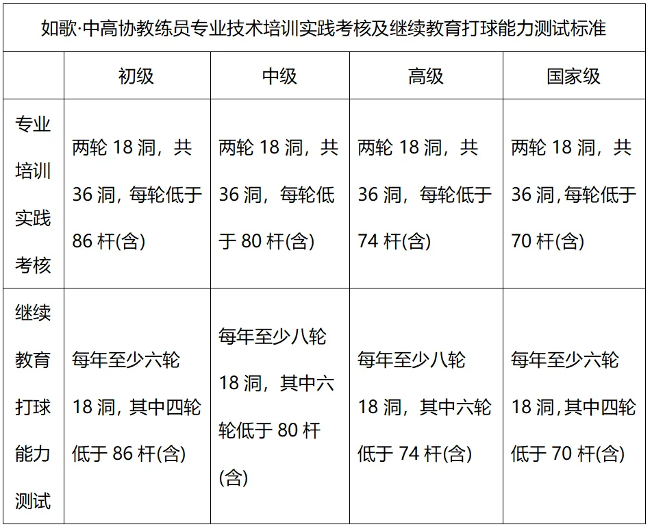 根據(jù)《中國高爾夫球協(xié)會(huì)教練員培訓(xùn)管理辦法(2024試行版)》相關(guān)要求,各級(jí)別專業(yè)技術(shù)培訓(xùn)實(shí)踐考核及繼續(xù)教育打球能力測試的成績標(biāo)準(zhǔn)如下(最終標(biāo)準(zhǔn)以中國高爾夫球協(xié)會(huì)官網(wǎng)公布為準(zhǔn)):