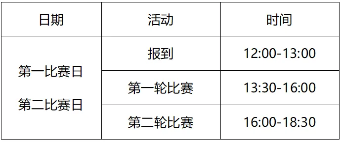 (二)報(bào)到時(shí)間:比賽日 8:00-8:30 12:00-13:00 (以參賽短信通知為準(zhǔn))
