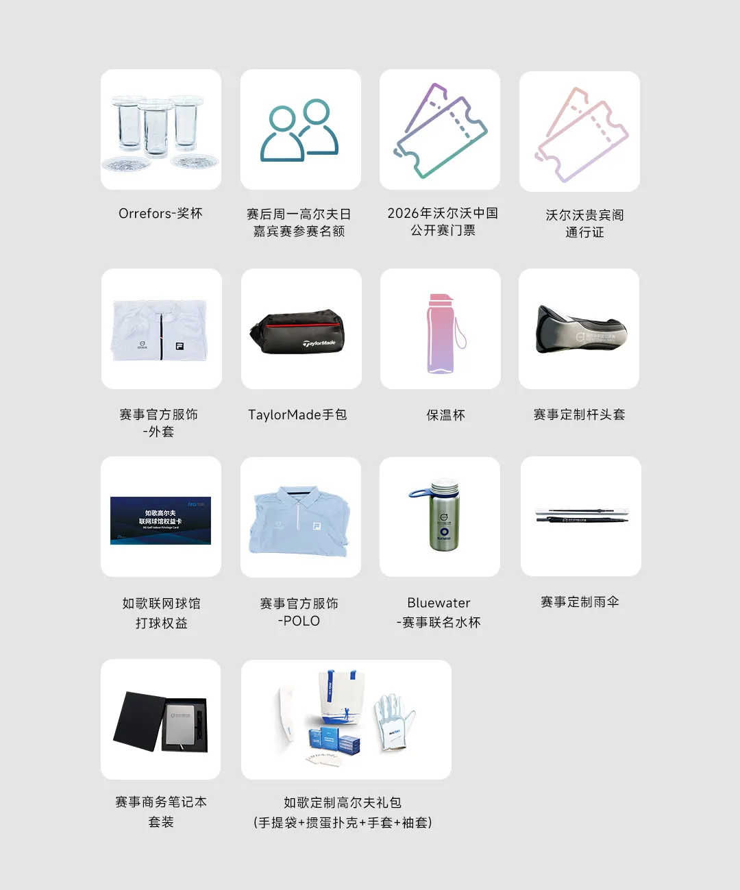 今年線上挑戰(zhàn)賽在福利繼續(xù)升級,獎(jiǎng)品加碼!只要參賽,就有機(jī)會帶走:2026年沃爾沃中國公開賽門票(含限量沃爾沃貴賓閣通行證)、賽后周一高爾夫日嘉賓賽參賽名額、Orrefors紀(jì)念獎(jiǎng)杯、賽事官方服飾、TaylorMade手包、賽事定制桿頭套以及如歌聯(lián)網(wǎng)球館打球權(quán)益等獎(jiǎng)品,覆蓋觀賽體驗(yàn)、實(shí)用裝備與持續(xù)打球權(quán)益等多個(gè)層面。
